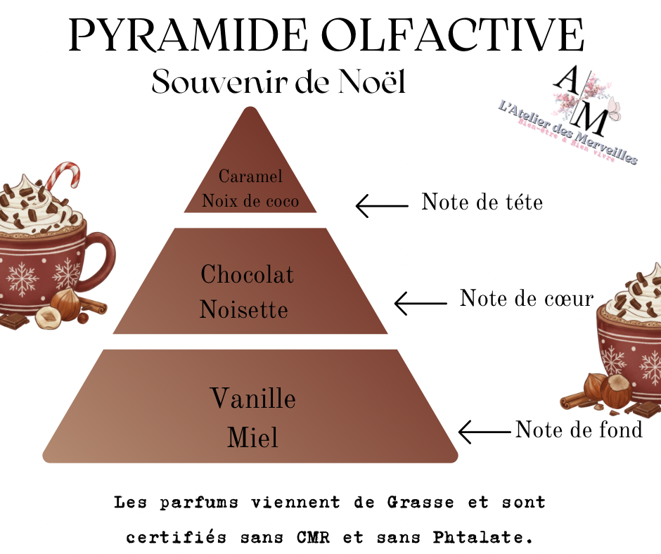 Souvenir de Noël diffuse une fragrance douce et réconfortante, inspirée des plaisirs simples des fêtes d’hiver. Les notes de noix de coco et de caramel ouvrent la danse, suivies d’un cœur généreux de chocolat fondant et de noisette grillée. En fond, la vanille et le miel apportent une chaleur enveloppante et gourmande.