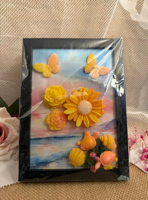Orné de délicates fleurs orangées, de tortues et de papillons, ce cadre décoratif évoque la chaleur du sable fin, la brise tropicale et les couchers de soleil dorés. Chaque fondant est soigneusement moulé pour offrir une composition aussi esthétique que parfumée.